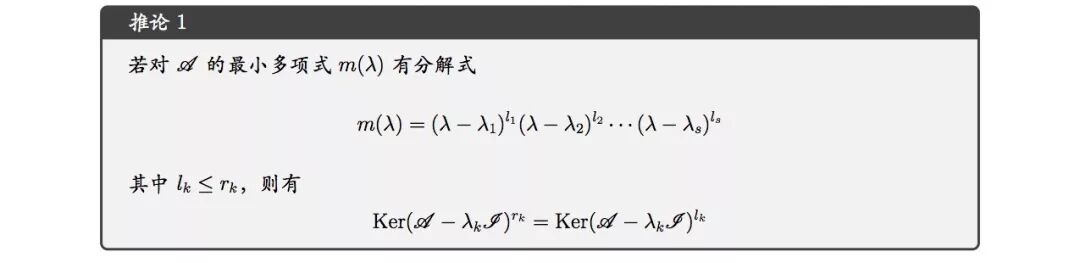 事实上,这可以解释为什么Jordan块的阶数与初等因子高度相关,因为考虑最小多项式时,所有重数最高的一次因式均出现在最小多项式之中,该重数直接对应上式特征值的重数,进而对应Jordan块的阶数.
