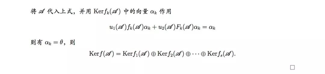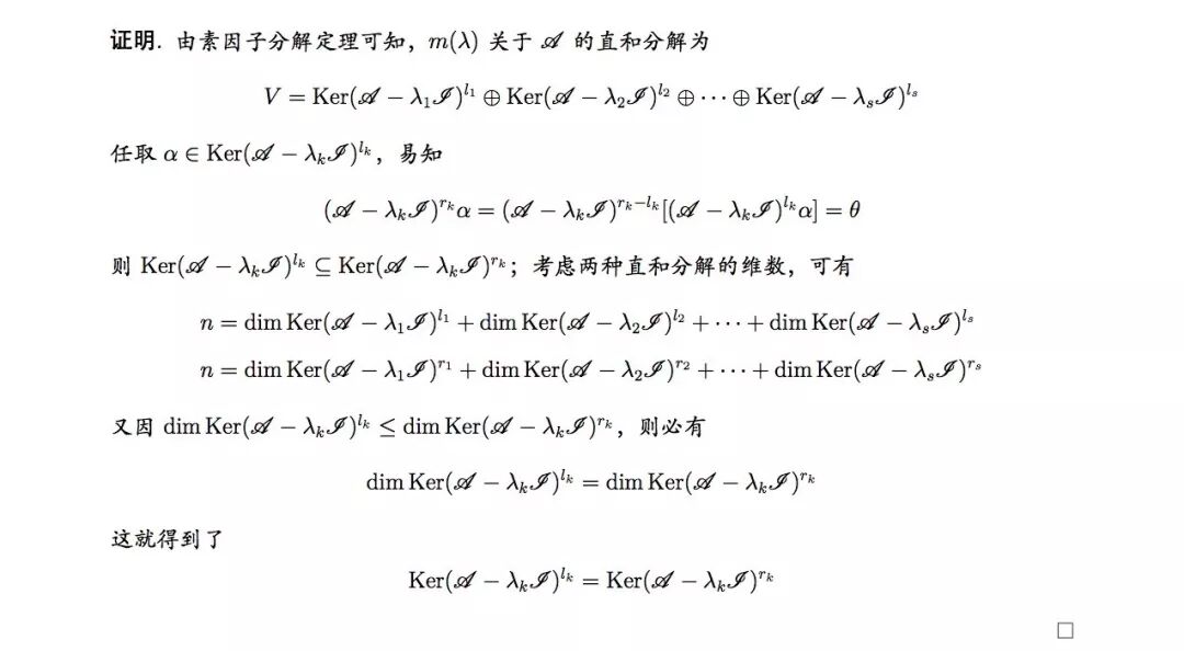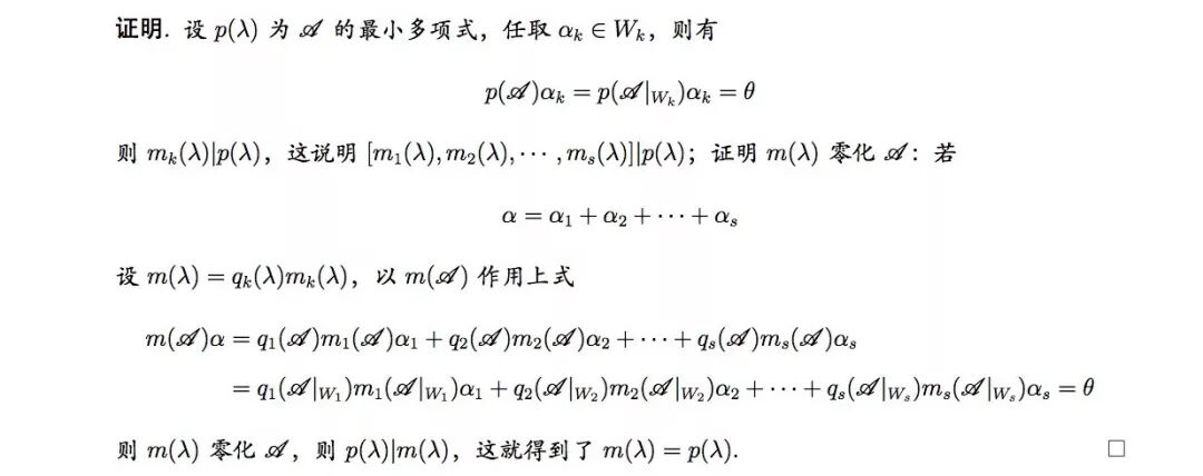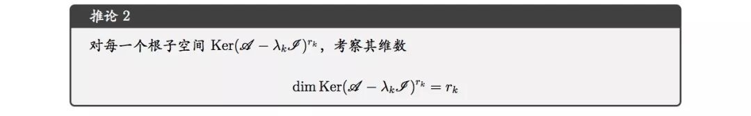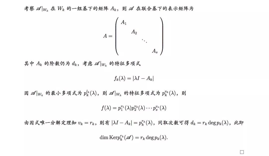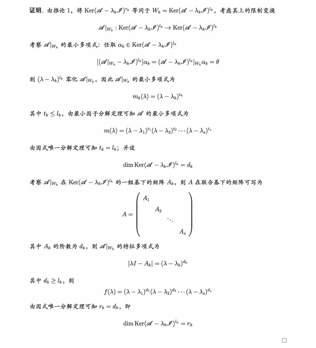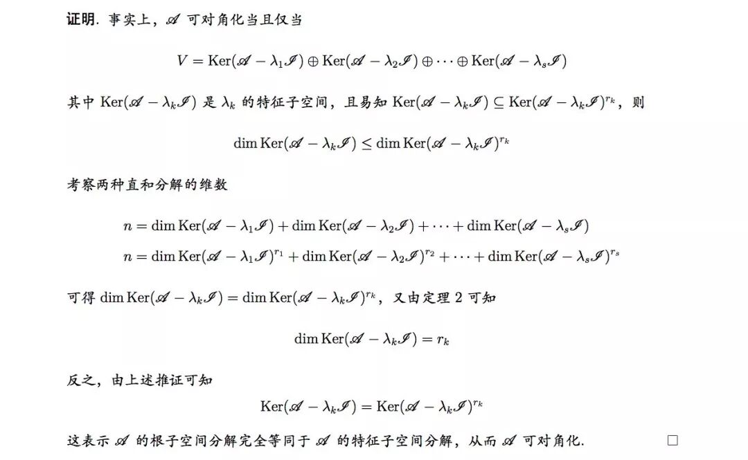 细心的读者可以看到,这就是可对角化的重要的充要条件:几何重数与代数重数相等,其他教材基本上也是用一些秩不等式来解决这个问题,但是从什么角度看都不是本质的,这个证明简短但却是本质的.