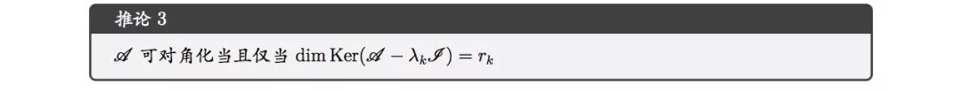 推论3有时会翻译成其他的形式,这就是关于线性变换可对角化的内容了,这一部分内容我早就在之前的文章中给出了,有兴趣的读者可以看到这篇文章线性变换可对角化的充要条件的互证与推论